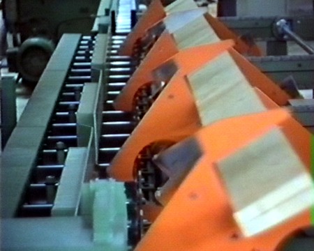 Mit dieser Einrichtung werden hochkant einlaufende Werkstücke um 90° gewendet und an eine anschließende Transporteinrichtung z.B. Quertransport vor einer Stapelmaschine, übergeben.