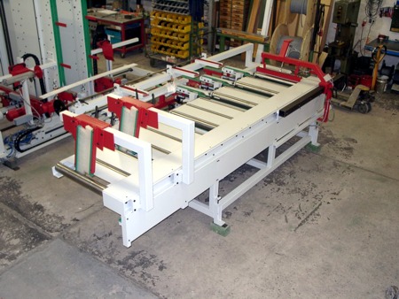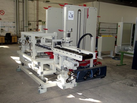 The machine adjusts automatically to the desired workpiece unit number. This machine can be also installed after cross-processing machines. This machine enables workpieces arriving on end to be removed and with the aid of brushes tipped either to the left or to the right before they are batched, one above the other.